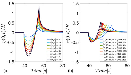 Time series of generated water waves with the analytical solution (11) modifying (a) landslide velocity and (b) length–thickness of the landslide.