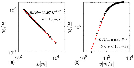 Normalized run-up () versus (a) length–thickness of the landslide (inputs: m, , m/s) and (b) velocity of the landslide (inputs: m, , m, m). Circle markers correspond to the curve related to ; red dashed line is the logarithmic trend curve. Both sub-figures are Log–Log plots.