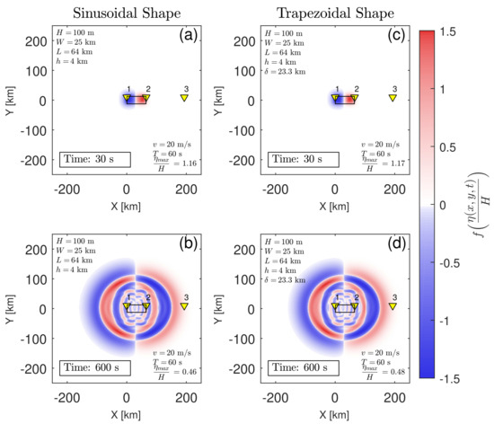 Snapshots of tsunami propagation for a gigantic underwater landslide event, assuming (a,b) sinusoidal shape; (c,d) trapezoidal shape. The inputs to this model are shown in the upper left and lower right of each snapshot. The color palette is scaled with the function , and . Numbers 1 to 3 represent virtual stations. The simulation time is min.