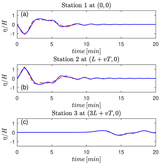 The next test compares the time series for sinusoidal and trapezoidal landslides for different subcritical velocities, water depths, and coordinates of the stations in Figure 11. Our purpose with this test is to make a comparison between the time series generated by the sinusoidal and trapezoidal landslide, varying water depth, and landslide velocity. The inputs are km, km, m, m/s, s, and min.
