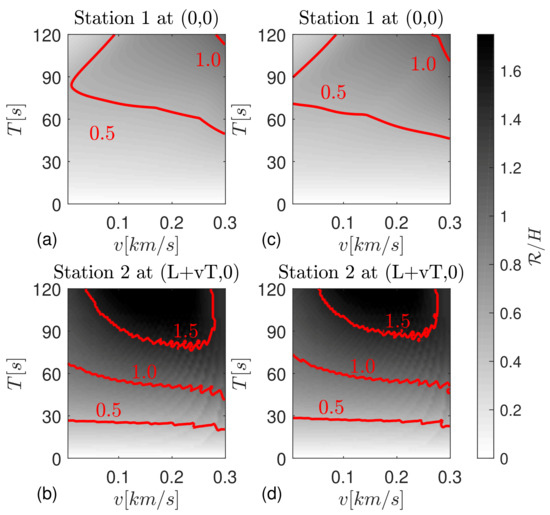 Figure 9 presents a broad variation of the run-up in terms of the slide duration and landslide velocity. Here, the maximum run-up relative to the two stations is displayed. The station at presents the higher amplification, where the directivity effects are stronger. In Figure 9b,d, it is observed that the amplification is the highest due to a landslide velocity with nearly critical velocity.