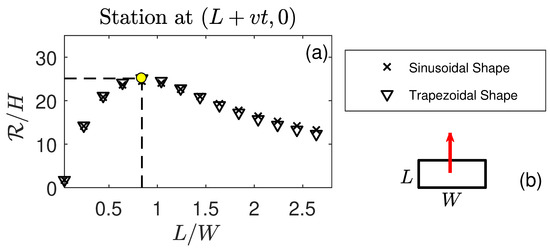 Figure 10a presents a series of simulations for trapezoidal and sinusoidal landslide shapes, where the yellow point corresponds to the maximum value of , and its coordinate is (0.84, 25.13). For this analysis, we assume that km, m, km, km, s, min, and the domain limits are km; km3, and as the landslide length changes for each simulation, the landslide thickness must also change (to keep constant). Therefore, the expressions for H are as follows: sinusoidal shape, ; trapezoidal shape, .