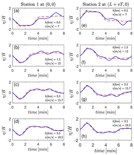 Time series of the stations for a gigantic submarine landslide. (a,d) Station 1. (e,h) Station 2. The inputs are s, km, km, m, m/s, km, km, s, and −350 km 350 km. For (a–d) at the southeast and (e–h) at northeast, the values of h and v used in this experiment are shown. For all subplots, blue solid line is for trapezoidal shape, and red dashed line is for sinusoidal shape. The simulation time is min.