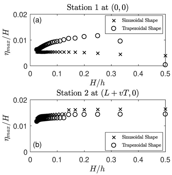 In Figure 13, the maximum amplification of the tsunami generated by the sinusoidal and trapezoidal landslide for different values is presented. In Figure 13a, for both models, it is observed that tends to 0.016 when . On the other hand, for Station 2 (Figure 13b), the trend is similar, but the values of are slightly lower for the trapezoidal shape. In addition, there is a vertical gap at , and for , there is a plateau in both curves . For Figure 13a, the curve for the sinusoidal shape tends to 0.005, but the trapezoidal shape has a different curve, reaching a maximum at .
