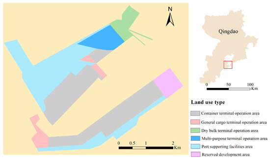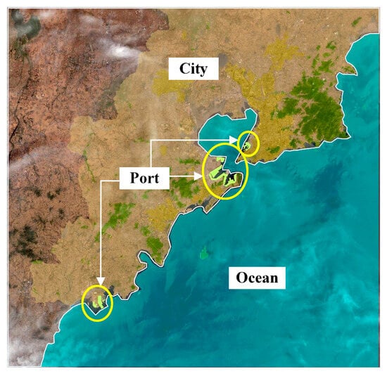 Since the extent of the research port area is small, and the distribution of land use functions in the port area is relatively orderly, high-resolution Google Earth images from 2020, which possess a spatial resolution of over 2 m, were utilized in this paper. The land use functions were identified based on the high-resolution Google Earth images, and previous port planning information on the research port area was also applied here to improve the accuracy of classification.