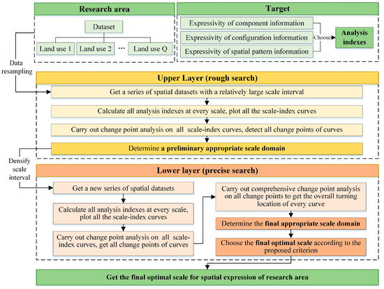 In the upper layer, the spatial datasets of the research area at scales with a relatively large interval are collected, and the chosen analysis indices of the research area are calculated separately at these scales. Next, the scale–index curves are plotted, and the change point analysis method is applied to accurately detect all the change points of every curve. Then, an appropriate preliminary scale domain is determined first.
