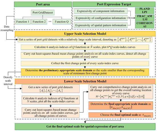 The accuracy of spatial expression is closely related to spatial scale, which is defined as the size of the grid in this paper. In order to reasonably determine the optimal scale for spatial expression, this paper proposes a two-layer framework for the scale selection process of all sizes of research areas. A port area is taken as an example to systematically clarify the application of this framework, and a scale selection model for port spatial expression is established. A least-squares-based mean change point analysis method and a new concept of a comprehensive change point are introduced to help determine the final optimal scale. A port area in Qingdao in eastern China is taken as an example to verify the feasibility of the proposed model. The results prove that the proposed scale selection model can well recognize the overall turning location of every scale–index curve, and the optimal scale selected via the proposed framework can satisfy the requirements of the expressivities of component information, configuration information and spatial distribution information. The optimal scale for the research port area is finally suggested to be 14 m.