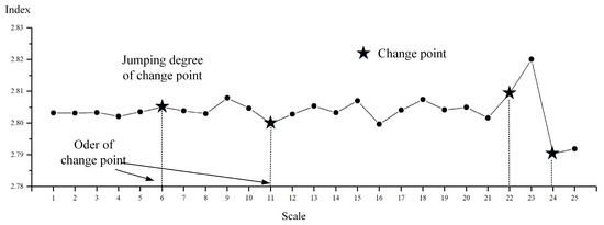 Therefore, a compromise is made between the order of change point locations and the variation extent of change points, and a new concept of a comprehensive change point is proposed. It is defined as the comprehensive change point location of a scale–index curve, which represents the overall turning location of the curve from a mathematical perspective. The comprehensive change point is calculated as the weighted sum of all change point locations of the curve. The determination of the weight considers both the order of change point locations and the variation extent of change points, which is measured by the jumping degrees of change points in this paper. The specific calculation process is as follows.