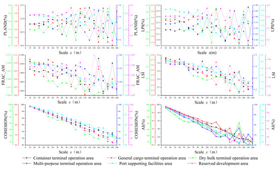 Since there exists a trestle wharf, which is a narrow and long space extending to the water area in the dry bulk terminal operation area, the variations in indices in the dry bulk terminal operation area are all more sensitive to the increase in scales, especially FRAC_AM and LSI, which represent the expressivity of configuration information. The variations in FRAC_AM and LSI in the dry bulk terminal operation area both suffer obvious decline, respectively, around the scale of 50 m and 60 m, which means that the configuration of the dry bulk terminal operation area is complex and gradually becomes regular when the scale increases. The curves of PLAND and LPI of the dry bulk terminal operation area fluctuate sharply beyond the scale of 50 m, which means that the component information of the dry bulk terminal operation area is relatively accurate within the scale of 50 m. The variations in COHESION and AI first decline smoothly but begin to change the tendency, respectively, from the scale of 50 m, which reflects that the physical connectedness and aggregation degree of the dry bulk terminal operation area both decrease when the scale increases, and the decrease process is not stable.