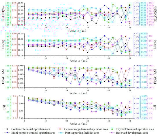 Taking the dry bulk terminal operation area as an example, it can be found that the fluctuation of the scale–PLAND curve increases rapidly beyond the scale of 32 m, while the downward trend of the scale–LSI curve begins to suffer an obvious fluctuation beyond the scale of 24 m. Moreover, it is obvious that the scale–LPI curve and the scale–FRAC_AM curve both appear to experience a prominent decline beyond the scale of 40 m. That is to say, the proposed comprehensive change point analysis can well reflect the overall turning locations of the four curves of the dry bulk terminal operation area.