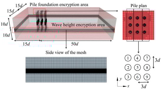 The numerical tank boundaries were configured as follows: the left boundary of the numerical tank was set as the velocity inlet, the right and upper boundary as the pressure outlet, the bottom boundary as the non-slip wall, and the two sides were symmetric planes. The tank dimensions were 65 × 30 × 20 d (where d represents the diameter of the pile foundation), and the pile foundations were immersed to a depth of 10 d. The wave generation and suppression area were 2.5 d and 3.0 d in length, respectively. The center-to-center distance between piles was 3 d, and the distance between the middle pile and the two walls was the same. The medium-cut body mesh was used to encrypt the focusing wave and current transmission area and the pile foundations. The total mesh contained approximately 2.8 million. The numbering of the pile foundations and the grid division of the computational domain are shown in Figure 1.