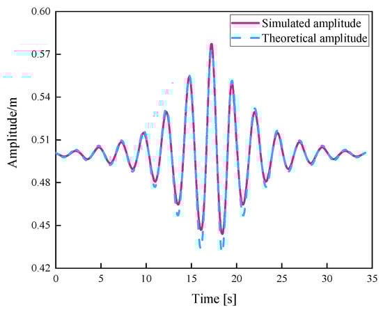 The comparison between the simulated and theoretical amplitudes of the focusing waves is shown in Figure 2. Generally, the amplitude of the focusing waves increased steadily over time, reaching a maximum at the focusing point before gradually decreasing. The wavefront was symmetrical on both sides of the crest or trough. The simulated curve aligned well with the theoretical curve. However, due to the influence of numerical dissipation during simulation, a suppression phenomenon occurred near the peak of the wave, resulting in slight discrepancies in the amplitude between the two curves. Nevertheless, the overall agreement met the validation requirements, demonstrating the accuracy of the method described.
