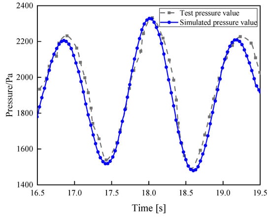 Figure 3 presents a comparison between the simulated and measured pressure on the surface of a single pile foundation. The two curves aligned closely, with only a minor discrepancy at the peak pressure value, approximately 6.58%, due to viscosity dissipation during the wave simulation. This slight deviation confirmed the accuracy of the model in capturing the interaction between the focusing waves and the pile structure.