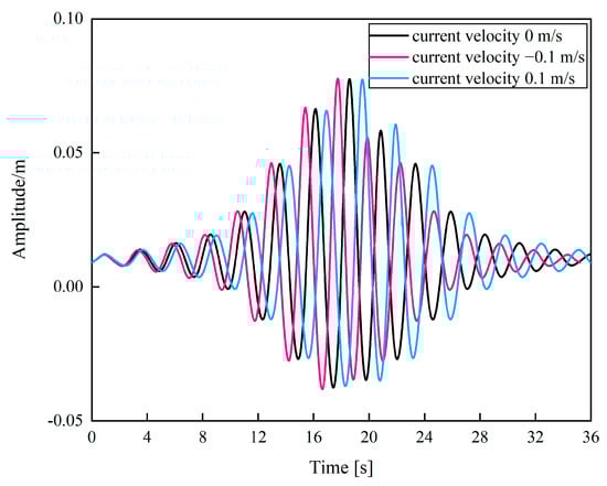 Figure 4 shows the fluctuation curves for three different current velocities with a wave amplitude of 0.08 m. The forward current reduced the wave amplitude at the focal point and delayed the aggregation time compared with the no-current case, while the reverse current showed the opposite trend. This phenomenon aligns with descriptions found in the literature [73], which explain that the interaction between the current and the focusing wave leads to an exchange of energy. The forward current absorbs energy from the focusing wave, decreasing its amplitude, whereas the reverse current transfers energy to the focusing wave, increasing its amplitude.