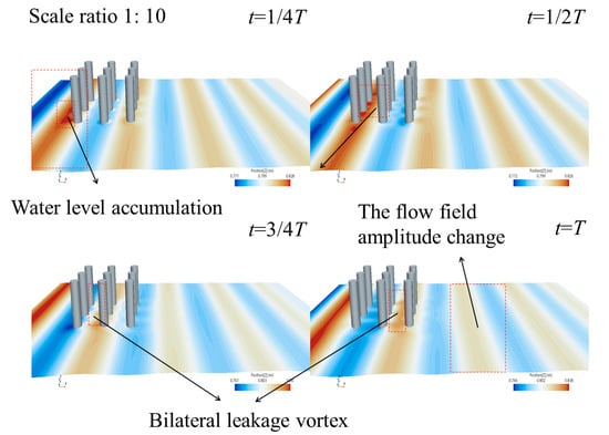 Figure 5 shows a three-dimensional diagram of the wave climbing around the pile foundations with a wave amplitude of 0.04 m and a current velocity of 0.1 m/s. The figure illustrates the water level accumulation in front of the piles and bilateral leakage vortices as the flow moves around the foundations. The flow field around the foundations remained relatively moderate and stable. When the current direction was reversed, only the focusing wave amplitude and the focusing time changed, while the wave climbing pattern remained similar to that in the forward current case.