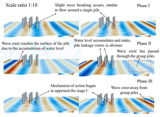 Figure 6 depicts the three-dimensional wave climbing diagram for the group piles under a wave amplitude of 0.08 m and a current velocity of 0.1 m/s. The flow interaction could be divided into three stages based on whether the highest wave peak reached or left the pile. In stages I and III, the peak was far from the pile foundation, and the flow field remained consistent. However, in stage II, the wave-breaking effects, water accumulation, and lower water levels were more pronounced compared with the case with a wave amplitude of 0.04 m.