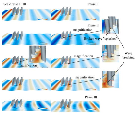Figure 7 depicts a three-dimensional wave climbing diagram of the group piles with a wave amplitude of 0.12 m and a current velocity of 0.1 m/s. The flow around the piles was divided into three stages, based on whether the greatest wave peak reached the surface of the pile foundations. Stage I and stage III occurred under smaller focusing wave values, where the effect of water on the pile foundations was moderate. In stage II, a pronounced nonlinear phenomenon occurred. As the highest wave peak approached the pile foundations, the water level accumulation in front of the piles caused the wave to break. When the peak reached the surface of the piles, the water impacted the foundations with a “bang”, creating a splashing effect. After passing the front-row piles, the wave rolled behind them, resulting in a “hydraulic jump” phenomenon [75]. The water level accumulation in front of the back-row piles compressed and deformed the discharge vortex at the front. As the wave crest moved into deeper water, the breaking weakened. When the crest began to leave the pile foundations, leakage vortices on both sides converged behind the piles at the crest’s position.