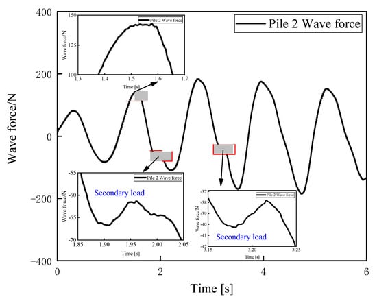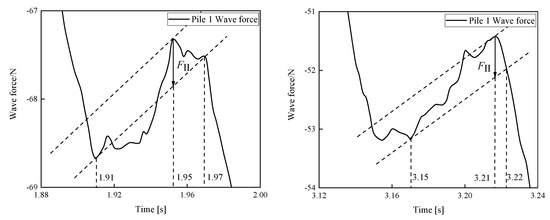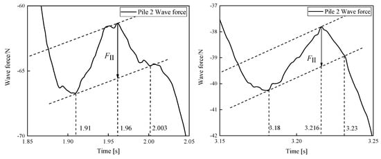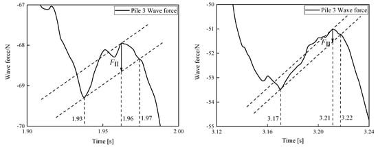 Figure 8 shows a localized enlargement of the secondary load, with further details of the force shown in Figure 9. In this study, the secondary cyclic load arose from the water level accumulation in front of the pile foundation and the wave breaking caused by flow compression around the piles. The duration of this phenomenon was brief, distinguishing it from pure wave breaking or other intense nonlinear conditions. The secondary loads lasted for 0.093 s and 0.05 s, respectively, accounting for 8.0% and 4.3% of the wave cycle. A distinct secondary cyclic load phenomenon was only observed in the wave force curves for the front-row piles in the group.