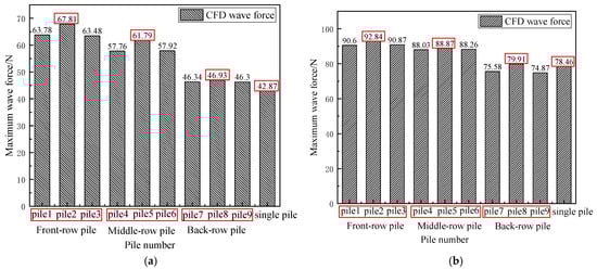 Comparison of maximum wave force on pile foundations. (a) Focusing wave and current in the same direction. (b) Focusing wave and current are reversed. (The red square box represents the same row of pile foundations).