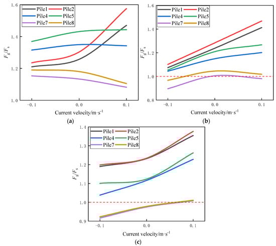 For the front-row piles (piles 1 and 2), the dimensionless wave force curves exhibited an overall upward trend, with differences in the rate of increase depending on the wave amplitude. However, as the wave amplitude increased, the difference between the dimensionless wave forces for piles 1 and 2 decreased, and the dimensionless wave force decreased at each current velocity. For the middle-row piles (piles 4 and 5), the dimensionless wave force curves displayed a smoother trend. Similarly, as the wave amplitude increased, the gap between the two curves narrowed, and the range of the dimensionless wave force decreased. The dimensionless wave force curves for the back-row piles (piles 7 and 8) showed more dynamic variation. When the wave amplitude was small, the dimensionless wave force decreased as the current velocity increased. However, when the wave amplitude was large, the dimensionless wave force increased with the current velocity, and the difference between the curves became more pronounced. This indicates that under large-amplitude waves, the group pile effect diminished, and the wave components dominated the generation of dimensionless wave force, while the influence of the current velocity decreased.