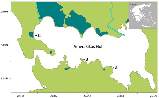 Several field surveys were conducted in regions where P. nobilis populations have been historically reported close to fish and shellfish farms: in the Aegean Sea, in mussel long line farms in the Maliakos Gulf [13,14,15,16] and in mussel farms in Thermaikos Gulf; and in fish and mussel farms in the Ionian Sea (Argostoli Gulf, Amvrakikos Gulf, Sagiada Strip) [17]. These surveys aimed to evaluate the status of P. nobilis populations. Furthermore, a parallel effort to enhance potential fan mussel recruitment was carried out through promoting the survival of young spat attached as biofouling in marine farming infrastructures by using aquaculture techniques “www.pinnasos.upatras.gr (accessed on 21 Sepember 2024)”. Mass mortalities were reported in all the examined regions except the Amvrakikos Gulf, where an overall recent mortality rate was estimated at 6.2% (excluded old dead animals) and where the present work is focused [6].