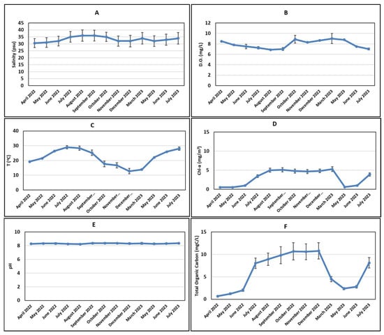 Water physicochemical parameters in the Amvrakikos Gulf: (A) salinity (psu), (B) dissolved oxygen D.O. (mg/L), (C) temperature (°C), (D) Chl-a (mg/m3), (E) pH, (F) total organic carbon (mgC/L).