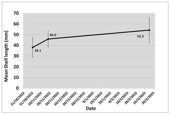 A total of 12 live juvenile P. nobilis individuals (nt0) with shell length 38.1 ± 9.2 mm were de-attached from the spat collectors. On 31 October 2022, 9 live individuals (nt1) were transferred to rearing trays in a mussel farm installation located in the northwest part of Amvrakikos Gulf. Thereafter, on 18 November 2022 (18 days on growing in the rearing trays), the trays were inspected for the condition of the juvenile fan mussels. Only 7 individuals (nt2) survived, with a shell length of 46.0 ± 7.4 mm. Finally, on 15 March 2023 (134 days in captivity), all 7 individuals (nt3) were found to have survived, with a shell length of 54.3 ± 11.6 mm (Figure 4). The shell growth of the young individuals during the period 31 October 2022 to 15 March 2023 is presented in Figure 5. The initial P. nobilis rapid shell length growth, followed by slower growth thereafter (Table 1).
