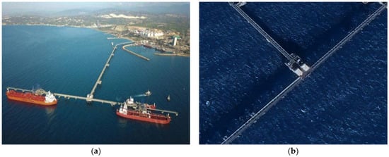 Reference marine structure situated off the coast of Vasiliko, Cyprus: (a) view of the entire jetty, (b) T-junction’s closer view.