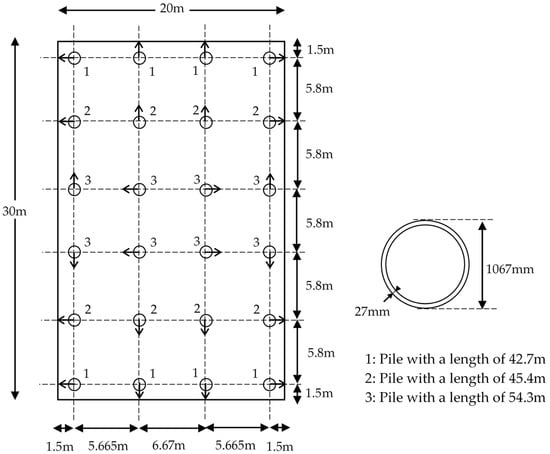 The examined T-junction structure features a reinforced-concrete (C35/45) deck that has a thickness of 1.30 m and dimensions of 32 m × 20 m. It is supported by a foundation system, consisting of 24 steel piles, which are inclined at a 1:3 rake. Their inclination directions and positions beneath the deck are shown in Figure 2. These piles feature a hollow circular cross-section, measuring 1067 mm in diameter and 27 mm in thickness. The assumed steel material, API L5 grade X65, is characterised by a yield stress (fy) of 450 MPa and an ultimate (fu) stress of 550 MPa.
