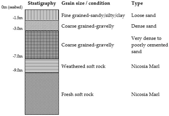 The marine structure under examination is presumed to be located 1.2 km offshore in the Vasiliko area of Cyprus, a region critical for the country’s energy infrastructure. The seabed depth in this area was found to be 17.7 m. Geological and geotechnical data for the site were supplied by VTTV, the owner of the marine jetty [35].