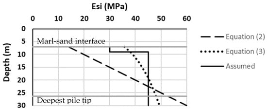 Figure 4 presents the Esi profiles for the Marl layers estimated from Equations (2) and (3). The Esi profile used in this study was derived from these estimates and is also depicted in the figure. It is assumed that the weathered layer of Marl exhibits lower Esi than the underlying fresh Marl, with uniform stiffness applied within each layer.