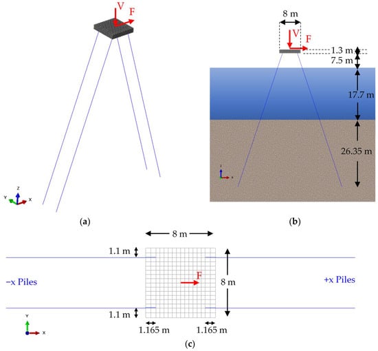 The SPSIjetty model (Figure 5) comprises a deck of 1.3 m thickness, supported by 24 inclined piles that possess the same geometric characteristics as those depicted in Figure 2. The effects of the trestles attached to the three sides of the T-junction are neglected, allowing the deck to move laterally without constraints. The SPSI8×8 model, which is depicted in Figure 6, comprises an 8 m × 8 m deck with the same thickness and elevation as the deck in the larger model. The lengths and cross-sectional area of the piles are identical to the SPSIjetty’s piles that are closer to the geometrical centre (see Figure 2). Finally, the foundation soil conditions for both models are assumed to be those described in Section 3.