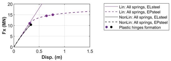 Impact of steel plasticity and nonlinear behaviour of springs on the force–displacement response of SPSI8×8 marine structure. The stages of plastic hinge formation are illustrated for analyses involving elastoplastic steel.