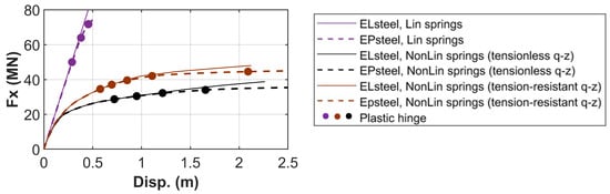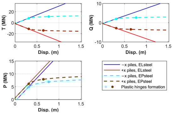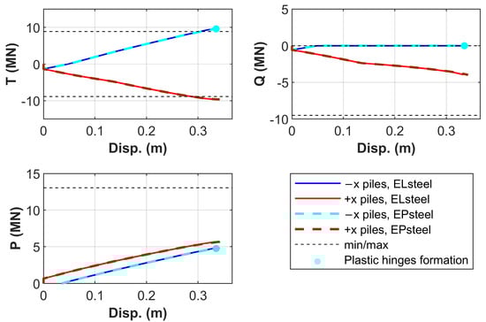 Sum of T, Q and P reactions forces of linear springs acting on the −x and +x piles, computed from analyses involving either elastic or elastoplastic steel.