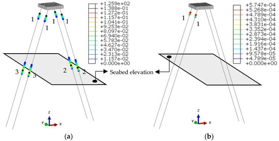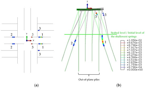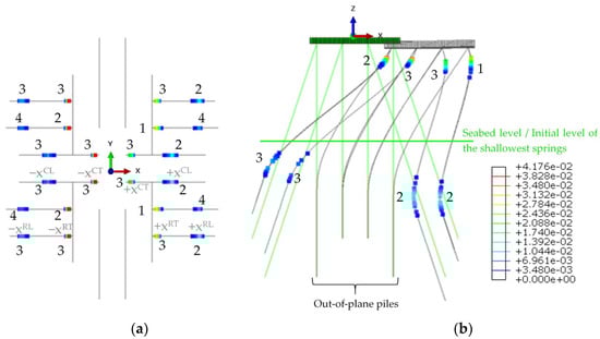A significantly different deformation mode and plastic hinge formation are predicted by the analysis with nonlinear springs and tensionless q-z springs, as illustrated by Figure 16. The figure demonstrates significant vertical displacements of the buried pile segments and horizontal displacements due to bending in the segments above seabed. Specifically, the in-plane −x piles exhibit an upward motion due to tension, whereas +x piles exhibit a downward motion due to compression. The out-of-plane piles, inclined perpendicular to the excitation load, exhibited limited deformation and bending, demonstrating their minimal role in the overall response. Thus, no plastic hinge formed on the out-of-plane piles, whereas two plastic hinges were created on each in-plane pile at failure.