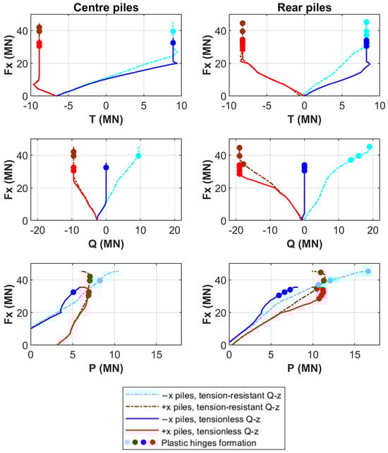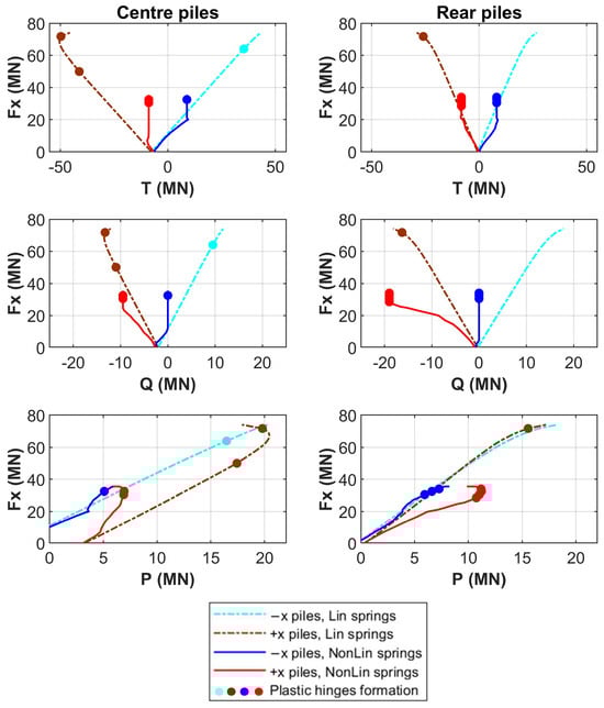 The impact of soil nonlinearity and steel plasticity on the response of the smaller SPSI8×8 marine jetty is demonstrated in Figure 8, which shows the output Fx-d curves. The figure verifies the more flexible response of the systems with nonlinear springs. This was the case until the system with nonlinear springs failed. As evidenced by Koronides et al. [20], who studied the same SPSI configuration, the failure took place due to the inability of the system to maintain vertical and moment equilibrium. This is due to the −x piles (see Figure 6c) reaching their axial capacity, as the sum of shaft (T) and base (Q) reaction spring forces reached their limits, as illustrated in Figure 9. The limits of T, Q, and lateral (P) reaction forces are calculated as the residual reaction force multiplied by the number of springs considered.