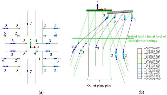 Plastic strain accumulation on the piles predicted by the analysis with linear springs, illustrated in (a) plan (x-y) view, and (b) side (x-z) view. The numbering indicates the sequence of hinge formation. The side view includes both initial (green) and deformed (black) structures, with displacements exaggerated by a factor of 5. All results are from the last converged increment of the analysis.