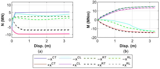 The above contrasts with the analysis using tensionless q-z springs, where steel yielding had a minimal impact on the system’s nonlinearity or bearing capacity. Plastic hinges were formed on steel piles when the system’s stiffness had already been degraded due to spring yielding. These hinges were primarily a result of bending, as both axial and shear forces were very small in comparison with their respective ultimate capacities. The axial forces (N) and bending moments (M) acting on the piles are impacted by the behaviour of the springs. Figure 18 presents N and M versus the horizontal displacements computed at the top of the platform centre. The presented N and M are calculated for eight cross-sections shown in Figure 15, −xCT, −xCL, −xRT, −xRL, +xCT, +xCL, +xRT, +xRL. Here, −x and +x indicate cross-sections on compressive and tensile piles, respectively; C and R refer to cross-sections at centre and rear piles; and T and L specify cross-sections at the pile top and at a lower position, respectively. Each of these cross-sections developed a plastic hinge during the analysis; therefore, the presented bending moments are expected to be the largest acting on the pile where each cross-section belongs.