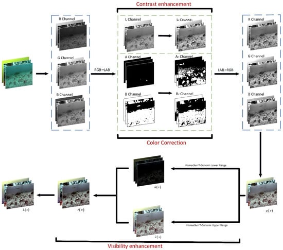 The approach presented in this paper works in a coordinated manner through a two-module strategy. First, the color correction module draws inspiration from biological vision [] techniques and operates in LAB color space. This module aims to mimic the way humans perceive colors to ensure a realistic representation of the underwater scene, employing optimizations such as gamma correction [], normalization, and contrast-limited adaptive histogram equalization to enhance contrast, improve visibility, and preserve local details. Meanwhile, the second module uses an improved Type-II Fuzzy set algorithm to enhance visibility. By improving the upper and lower limits of Type-II Fuzzy set computation, the visibility of the image is enhanced by using Hamacher t-conorm operator, and the image can be further refined by using the gamma correction computation based on the improvement, which can also fine-tune the brightness and the contrast of the image.