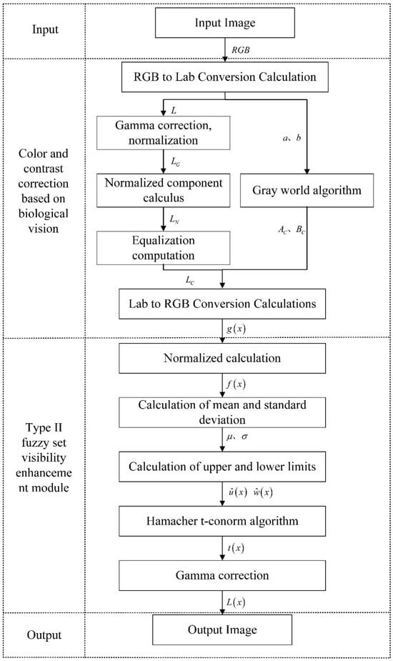 Based on the principle of biological vision, our method adds the color and contrast correction module of image processing and the visibility enhancement module based on Type-II Fuzzy set, which firstly restores the overall attributes of the underwater image, enhances the visibility and color truthfulness of the underwater image, and delicately processes the details of the image and improves the local visibility of the image; accordingly, the overall quality of the underwater image can be significantly improved. Below, we propose the algorithm of the method. Figure 2 shows the framework diagram of our method, and Figure 3 shows the flow chart of our method.