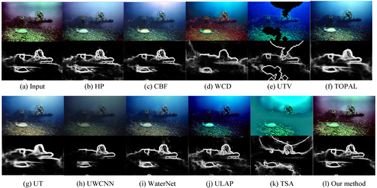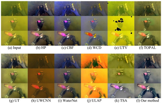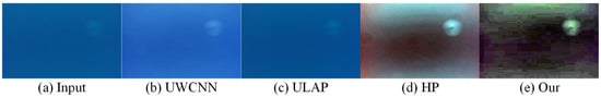 Our method encounters the same problem as other state-of-the-art methods, which is that the algorithm fails in environments with extreme color variations underwater and fails to achieve the desired image enhancement. Figure 11 shows a failure case of underwater images processed by our method and those processed by current state-of-the-art methods. The methods fail to minimize the color shift and recover and highlight the color of the observed object, indicating that the enhancement fails. The specific reason for the failure is that the color change will be very small in extreme change underwater environments; this causes the enhancement method to fail to remove the color shift. In the future, we intend to conduct research to solve the problem of extreme change underwater image processing.