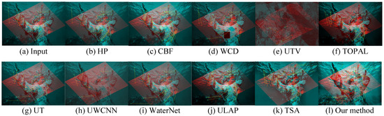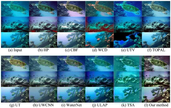 We processed and corrected real underwater images on the Test-U45 dataset with different methods; depending on the method, the solidity and accuracy of the color reproduction and equalization capabilities are different, as shown in Figure 5, where we obtained an exhaustive comparative analysis. WCD has a limitation in improving the quality of the underwater images, it cannot eliminate the bluish tints in the images, and it exhibits a significant white balance distortion phenomenon. The adjustment of the blue tones does not show any significant calibration. Images processed by UTV and ULAP exhibit color imbalance and an overall tonal shift. UWCNN corrects for the blue tones; however, the resulting images appear dimmer and have poor contrast. CBF adjusts the blue tones to some extent; however, this also results in the appearance of a red deviation. WCD and UTV in the color adjustment process produced undesirable red tones. Meanwhile, TOPAL and CBF maintained some light-blue tones. UWCNN enhanced underwater images often appeared to be dim, in which the color details were not sufficiently clear. HP inadvertently introduced a new green bias in its pursuit of green bias rejection. Meanwhile, UT and WaterNet show consistency in blue bias removal, but the blue shift phenomenon is still reflected. On balance, after comparing the various underwater image enhancement methods, this method shows the most stable performance, effectively correcting the white balance deviation caused by the shooting equipment, while achieving the optimal effect in terms of contrast. A green deviation value is added to HP to improve this problem. Compared with TSA, this method is richer in detail and texture, and effectively adjusts the blue and cyan color deviations. Compared to other methods, this method provides maximum correction for color variations in underwater images, while preventing white balance distortions caused by different cameras.