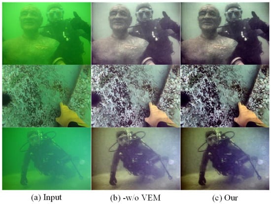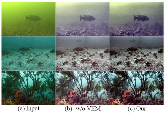 The ablation experiment of the proposed method is to validate the effectiveness of the components on both Test-C60 and Test-U45 datasets. Specifically, the image results obtained after verifying our method without the visibility enhancement module (-w/o VEM) based on Type-II Fuzzy set is shown in Figure 6 and Figure 7. The ablation experiments are performed to determine whether the performance of our method is good or not by evaluating the accuracy, robustness, and computational efficacy of the computation. It can be observed by visual comparison that, after removing the visibility enhancement module (-w/o VEM) based on the Type-II Fuzzy set, the color of the image is obviously defective, the image introduces excessive white color and adds dark-red shadows, which means that the white balance correction fails and the color is not realistic; at the same time, there is a foggy effect and the contrast enhancement is not obvious. The image we obtained with the complete dual module is much better in terms of both color and contrast correction and visibility enhancement. This experimental result also confirms the importance of the Type-II Fuzzy-set-based visibility enhancement module (-w/o VEM) in our algorithm, indicating the important role of the visibility module for color as well as contrast enhancement. The ablation experiments were also evaluated quantitatively, and the results are presented in Table 3 and Table 4 for the Test-C60 and Test-U45 datasets. The study shows that the full model performs better on both datasets compared to the ablation model. The results of our validation are also consistent with the initial experimental expectations. Also, each part of our proposed method is an integral and important component, which has a significant impact on obtaining good experimental results; meanwhile, the ablation experiments provide more evidence that our proposed two-module image enhancement strategy is a high-performing image processing technique.