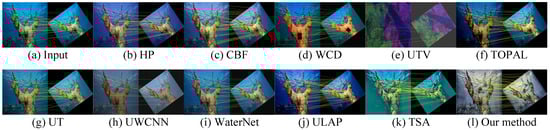 Applying our method to an advanced camera robot’s shooting task is used to test and compare the reliability and practicality of our method. Applying the algorithm to a robot’s shooting task is a common testing method for verifying the broadness of the algorithm, so we need to test our two-module strategy in detail. In the following, we will carefully explain the performance test results of our algorithm and the state-of-the-art algorithms for image processing enhancement in a total of three aspects: SIFT feature point matching, geometric transformation estimation, and edge detection. The results are shown in Figure 8, Figure 9 and Figure 10: Figure 8 shows that our two-module algorithm matches more feature points, so our method is better than the other methods; the images enhanced using our method will have better biological visual imaging quality, and more details of the image will be highlighted. Therefore, our method is more suitable for carrying out the work of recognition and matching of feature points. Figure 9 shows that our method outperforms other methods on geometric transformations: our method finds out the maximum number of geometrically transformed feature points, indicating that our method can look for missing geometric feature information, which is crucial for applications such as target identification and tracking. Figure 10 demonstrates the performance of the present method in edge recognition; the method successfully identifies the maximum number of edge details. Ultimately, the adopted technical approach significantly enhances the contrast and detail rendering of the edge region, which is of practical use for critical tasks such as navigation and obstacle avoidance in underwater navigation. In summary, our two-module strategy algorithm has strong application value in robots performing filming tasks.
