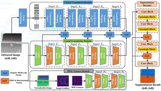 Figure 2 presents the overall structure of the proposed CGSegNet, which consists of four key stages. First, in the feature extraction stage, we employ a combination of CNN encoder, Transformer encoder, and traditional HOG feature extraction from infrared images. The CNN modules capture local granularity spatial features, the Transformer modules extract global granularity information, and the HOG method provides additional edge granularity information from infrared images. Second, we designed an adaptive multi-scale fusion module named (AFM) that addresses semantic inconsistencies and aligns the extracted features across different granularity branches, ensuring a coherent fusion of features. Furthermore, the fused features produced by AFM are fed into a segmentation head, where HOG features with edge granularity are integrated through a HOG–deep learning fusion (HDF) module. Finally, the segmentation head produces the final segmentation result. This framework is designed to effectively handle the challenges posed by infrared image segmentation in complex marine environments, such as low contrast and noise, ensuring accurate and robust segmentation performance.