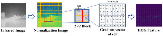 The HOG feature branch is used in our segmentation network to capture edge granularity from infrared images. This branch is particularly effective in highlighting object boundaries and structural information, which is critical in marine environments where object contours can be faint or obscured by noise. As illustrated in Figure 4, the HOG descriptor computes gradient orientations in localized regions of an image, allowing for robust feature extraction even in low-contrast settings.