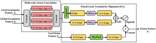 The AFM module consists of a multi-scale atrous convolution (MAC) operation and granularity alignment operation. The MAC module employs four atrous convolution layers, including a convolution layer and three convolution layers with different rates (1, 4, 8). The atrous convolutions [27], also named dilated convolutions, apply holes in the convolutional filters, effectively expanding the receptive field without increasing the number of parameters or losing information through downsampling.