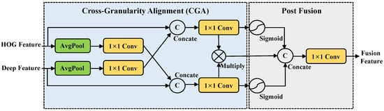 In our proposed HOG deep-learning feature fusion (HDF) module, we enhance the infrared image segmentation process by integrating edge gradient features extracted using the histogram of oriented gradients (HOG) with semantic features derived from deep learning networks. As HOG features only contain low-level edge information, we fuse them with high-level contextual features in the segmentation head to aggregate edge contextual information and boundary segmentation accuracy. To effectively combine both HOG and deep learning information, we designed a cross-granularity alignment (CGA) strategy presented in Figure 6. This alignment mechanism allows the model to selectively emphasize important regions in the image, blending local and global information to improve segmentation accuracy. For extracted HOG features and deep-learning features , we applied the CGA operation to generate enhanced HOG features and enhanced deep features , which can be calculated as follows:
