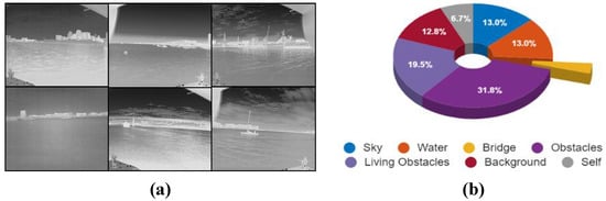 Massachusetts Maritime Infrared (MassMIND) dataset; (a) maritime infrared image samples, (b) pixel distribution featuring different classes in the MassMIND dataset.