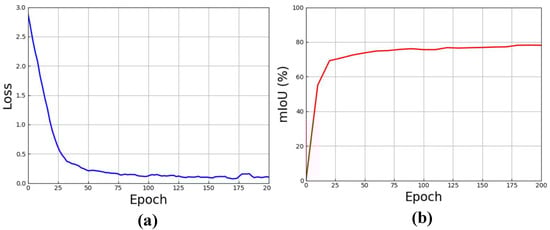 All experiments were conducted on a system equipped with an Nvidia GTX 3090 GPU with 24 GB of memory and an Intel i7-9700K CPU with 64 GB RAM. Our model was implemented in Python using PyTorch 1.9 and CUDA 11.4 for GPU acceleration. In our model, the model was trained for 200 epochs using a stochastic gradient descent (SGD) optimizer, with a mini-batch size of 8. The initial learning rate was set to 0.04, and a poly learning rate decay strategy was employed to progressively reduce the learning rate during training. Additionally, we utilize the classical cross entropy function as the loss function to train our model. The model parameters were randomly initialized, and we applied a data augmentation strategy, including random flipping (with a probability of 0.5), random rotation (ranging from −0.83 to 0.83 rad), and random cutting to improve the model’s generalization capabilities. The input image size of our model was set to 640 × 640 pixels. Figure 8 illustrates the training process of our model.